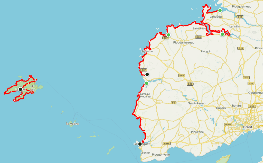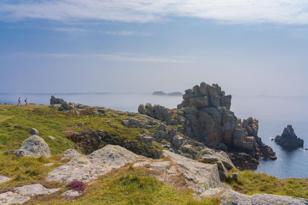 Depuis Porscav, le chemin mène à la pointe du Corsen, extrémité occidentale de la Bretagne, puis jusqu’au charmant port du Conquet, entre falaises et prairies sauvages.