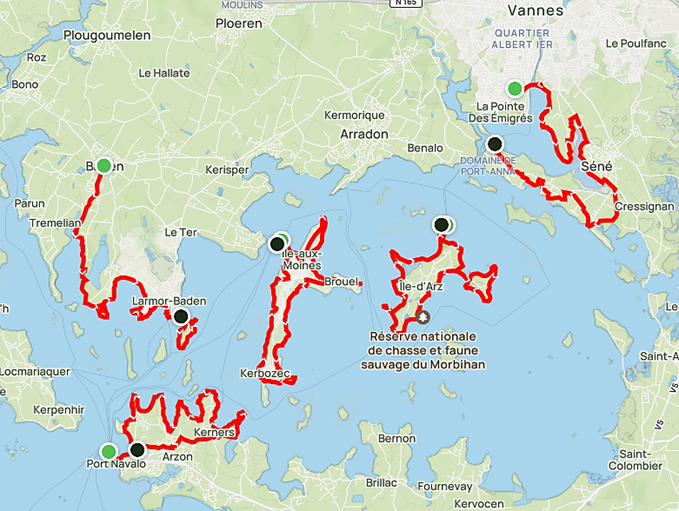 Traversée le matin vers la presqu’île de Moustérian. le long de la côte sud, face aux îles du golfe, les parcs ostréicoles jalonnent la fin de l’étape. Au coeur des anciens marais salants, désormais transformés en réserve naturelle, nichent de nombreux oiseaux marins. Vous rejoindrez Vannes par un chemin bucolique en sous-bois depuis le charmant village de Séné et les célèbres Sinagos, vieux gréements aux voiles rouges.