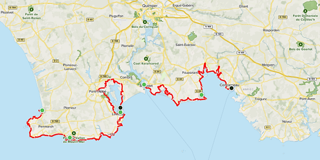 Dernière étape au cœur de la Riviera bretonne. Sur votre chemin, vous traverserez La Forêt-Fouesnant, village breton très boisé avant d’arriver à Concarneau où vous pourrez vous promener dans sa magnifique ville close.
