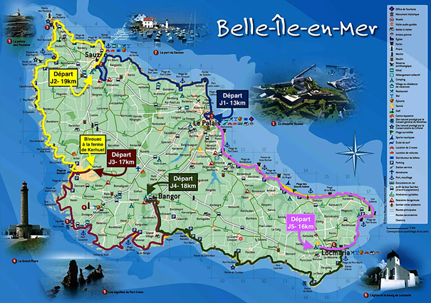 Début du séjour : le J1 au matin à la gare maritime de Quiberon, bateau vers 9h30. Accueil par votre accompagnateur le J1 au débarcadère de Palais.